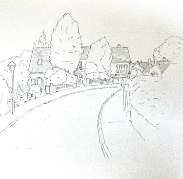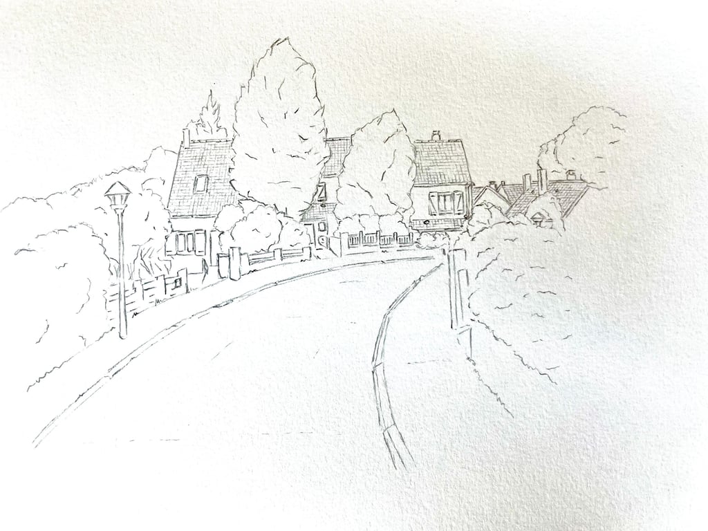 Série de dessins d'après photographies contemporaines du lotissement Gesvrine sur la commune de la Chapelle sur Erdre construit entre 1974 et 1984. Un programme immobilier du Groupe Maison Familiale qui comprenait la livraison de 857 maisons individuelles, un centre commercial, une maison de santé, deux groupes scolaires et une zone industrielle en périphérie.
