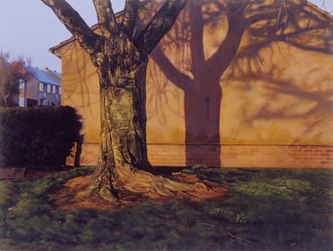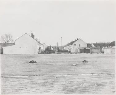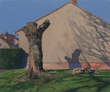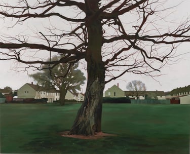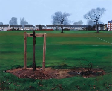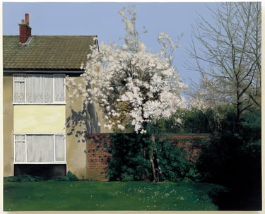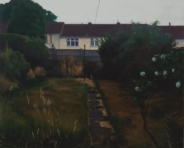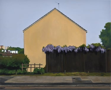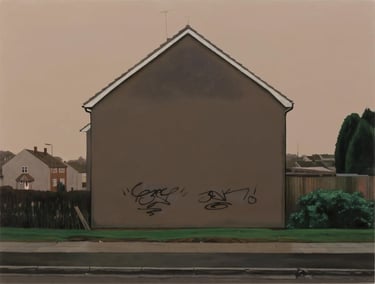 His works capture places imbued with nostalgia and melancholy: wastelands, parking lots, alleyways, and the ordinary settings of English middle-class life, elevating the mundane with striking precision.