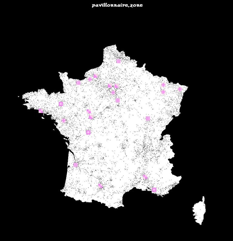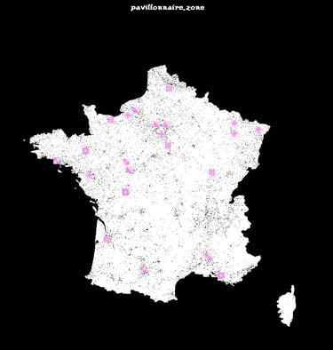 La map donne à voir, sans ambiguïté, et pour la première fois, la silhouette du pavillonnaire sur le territoire français. Pixels noirs éparpillés entre campagnes et centres-villes, la trace est issue d'un traitement des données carroyées de l'INSEE. Chaque pixel correspond à un carreau de 200/200 mètres, estimé à dominante pavillonnaire.