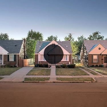 La maison est la matière principale des œuvres de l'artiste australien Ian Strange. À travers ses installations monumentales, il peint, découpe et met en scène de manière spectaculaire des lieux de vie abandonnés ou en cours de réhabilitation. Il interroge ainsi son passé d'enfant du suburbain, mais prolonge aussi l'histoire de ces quartiers. Sa série Suburban, a été initiée en 2011 et à suivi la crise des subprimes. certaines des maisons du projet avaient été saisies et démolies.