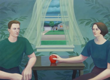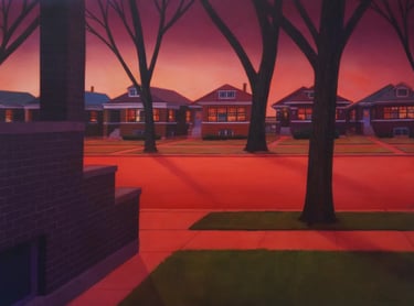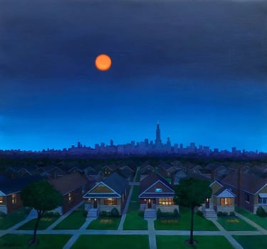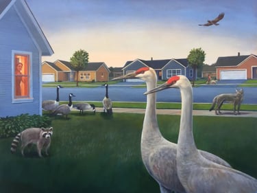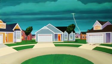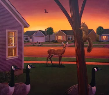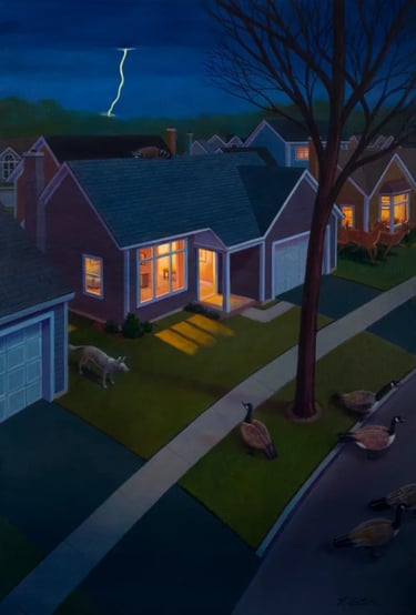 Kathleen Eaton est une peintre américaine originaire de Chicago. Ses séries de tableaux sont élaborés à partir de techniques mixtes pochoir, sérigraphie et peinture à l'huile. Nous sommes ici les témoins d'une curieuse vie de banlieue où les animaux de la forêt se seraient donné rendez-vous. Les humains semblent quant à eux confinés dans leurs maisons alors que l'orage gronde.