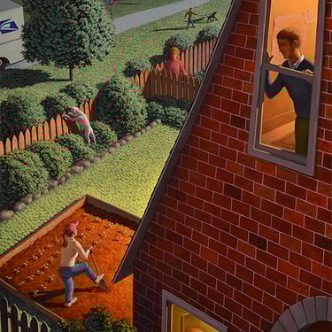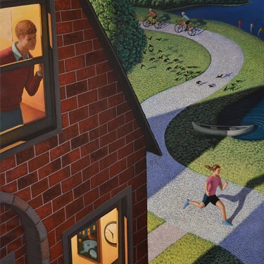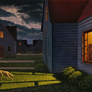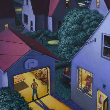 Les banlieues imaginaires du peintre Leonard Koscianski présentent cette naïveté qui me rappelle les couvertures de certains romans d'aventure jeunesse des années 80. Le traitement de la lumière, la mise en scène et les couleurs sont éclatantes. Cet univers étrange et fascinant est exposé dans les plus grands musées américains.