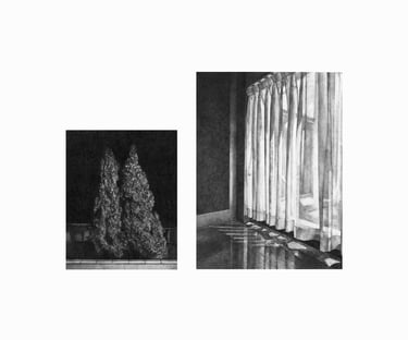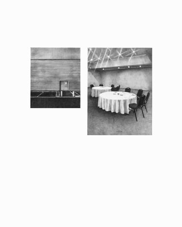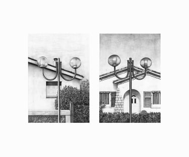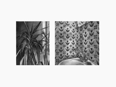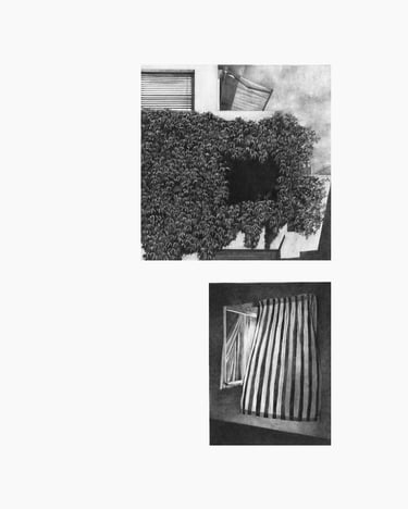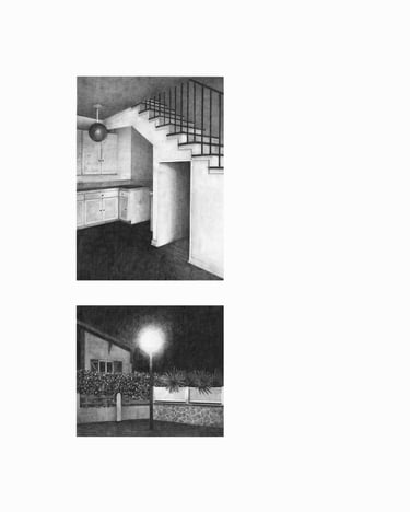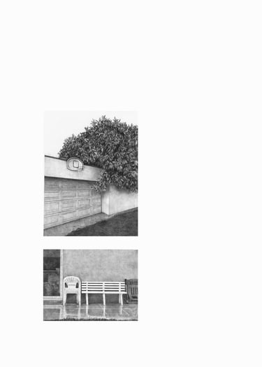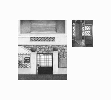 Pauline Martinet et Zoé Texereau créent des dessins impressionnants de réalisme à la mine graphite à partir de photos. Pour leur série Fiction, elles saisissent l'architecture du pavillon mais aussi l'environnement dans lequel il s'inscrit. Le duo expliquent vouloir dépeindre cette banalité étrange que l'on ne prend parfois pas le temps de contempler.