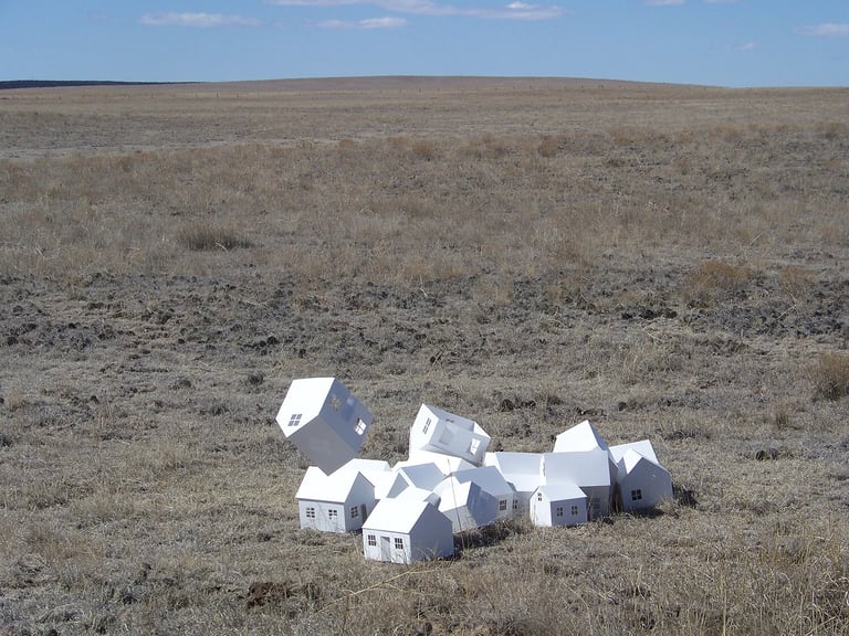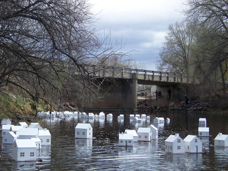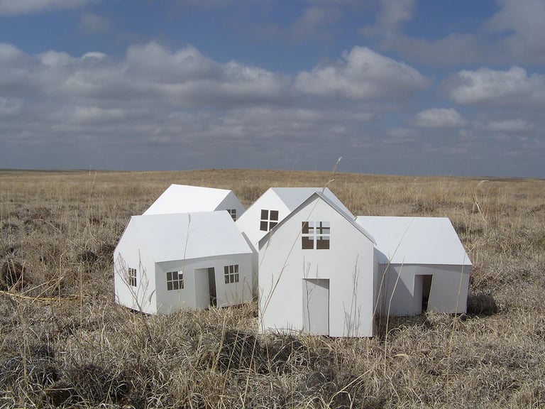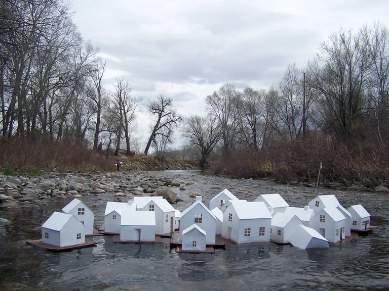 Stephanie Beck is an American artist who works with wood and paper. His project Little Houses appeared during his residency in Fort Collins, Colorado in 2011. Beck designs a hundred paper models of small houses. Their style will be both inspired by local architecture and standardized housing. The models will then be staged and confronted with the natural elements of the region such as wind and floods for three series of photos.